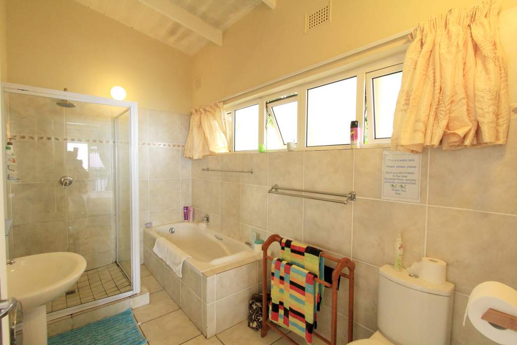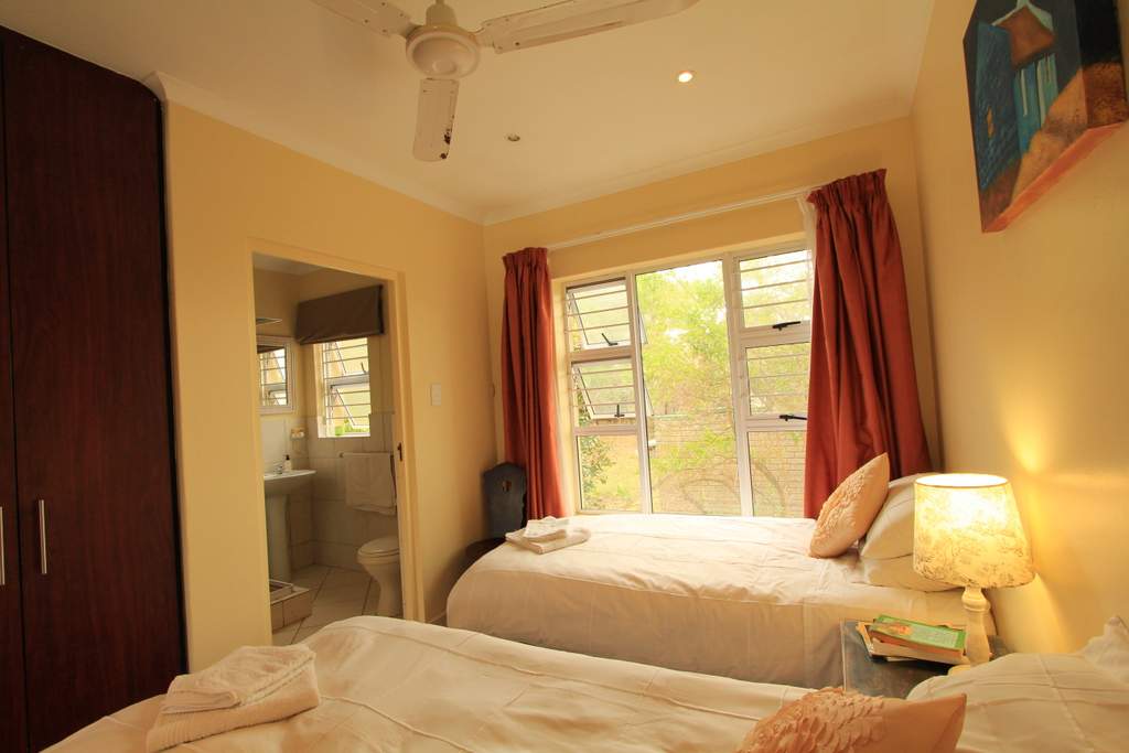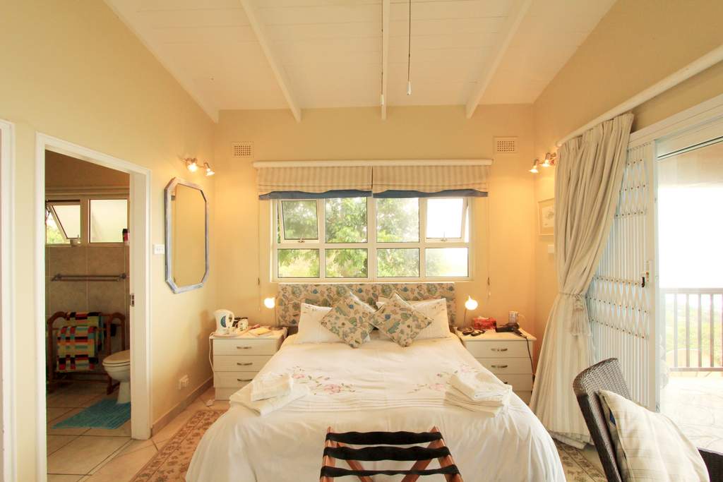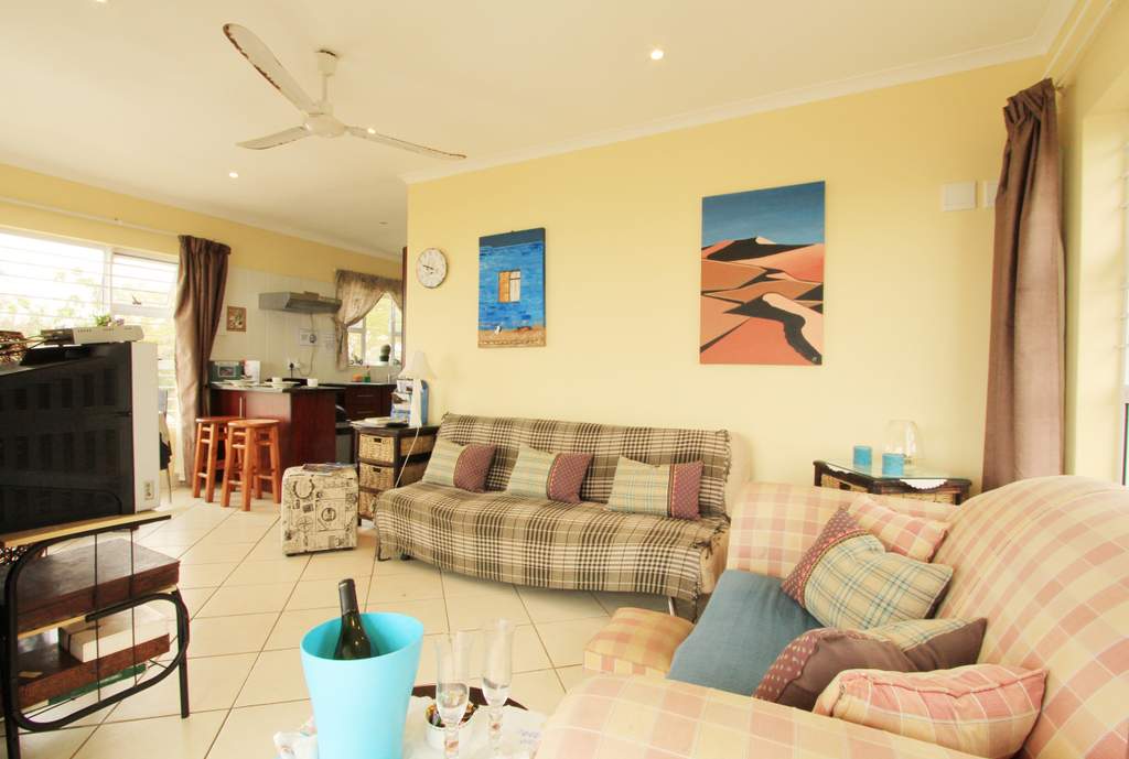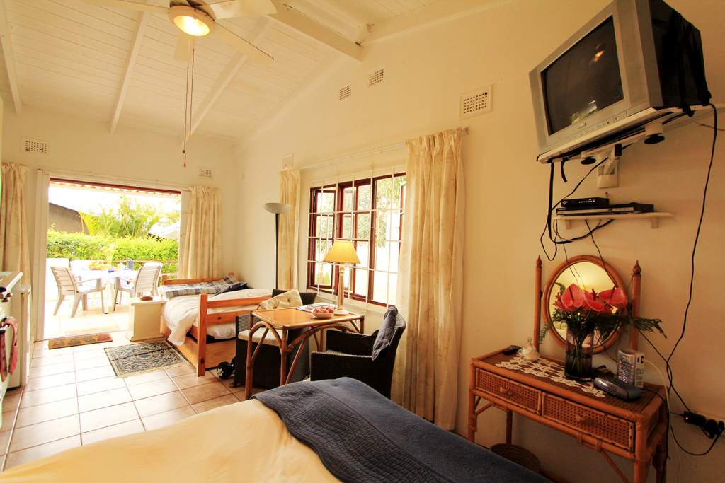 Self-catering garden cottage it is a studio with a double bed and bunk beds so will suit a small family or a couple there is a small kitchen, full bath and shower and very pleasant terrace with table and chairs and braai but NO sea view this is affordable accommodation!